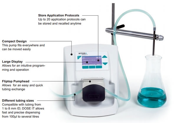 Peristaltic pumps are very helpful when dispensing culture media, buffers or other solutions. However, most pumps are difficult to program, oversized and bulky.
