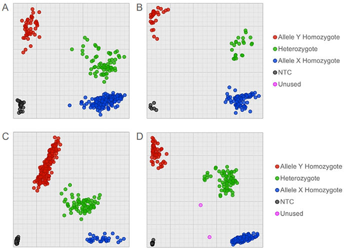 MGB assays designed for maize SNP identification were run on two different Biosearch Technologies low-volume, high-throughput automation platforms, allowing for liquid handling, thermal cycling, and fluorescence detection/analysis. Assays were run on the IntelliQube in 1.6µL reaction volumes in Array Tape (A and B) and the SNPline workflow in 1µL reaction volumes in 1536-well plates (C and D). Both crude-extracted (A, C and D) and sbeadex-purified (B) DNA gave clear clusters, allowing for clear and easy genotype identification. All assays were run with Biosearch Technologies' BHQ Probe Master Mix. Image credit: LGC Biosearch Technologies