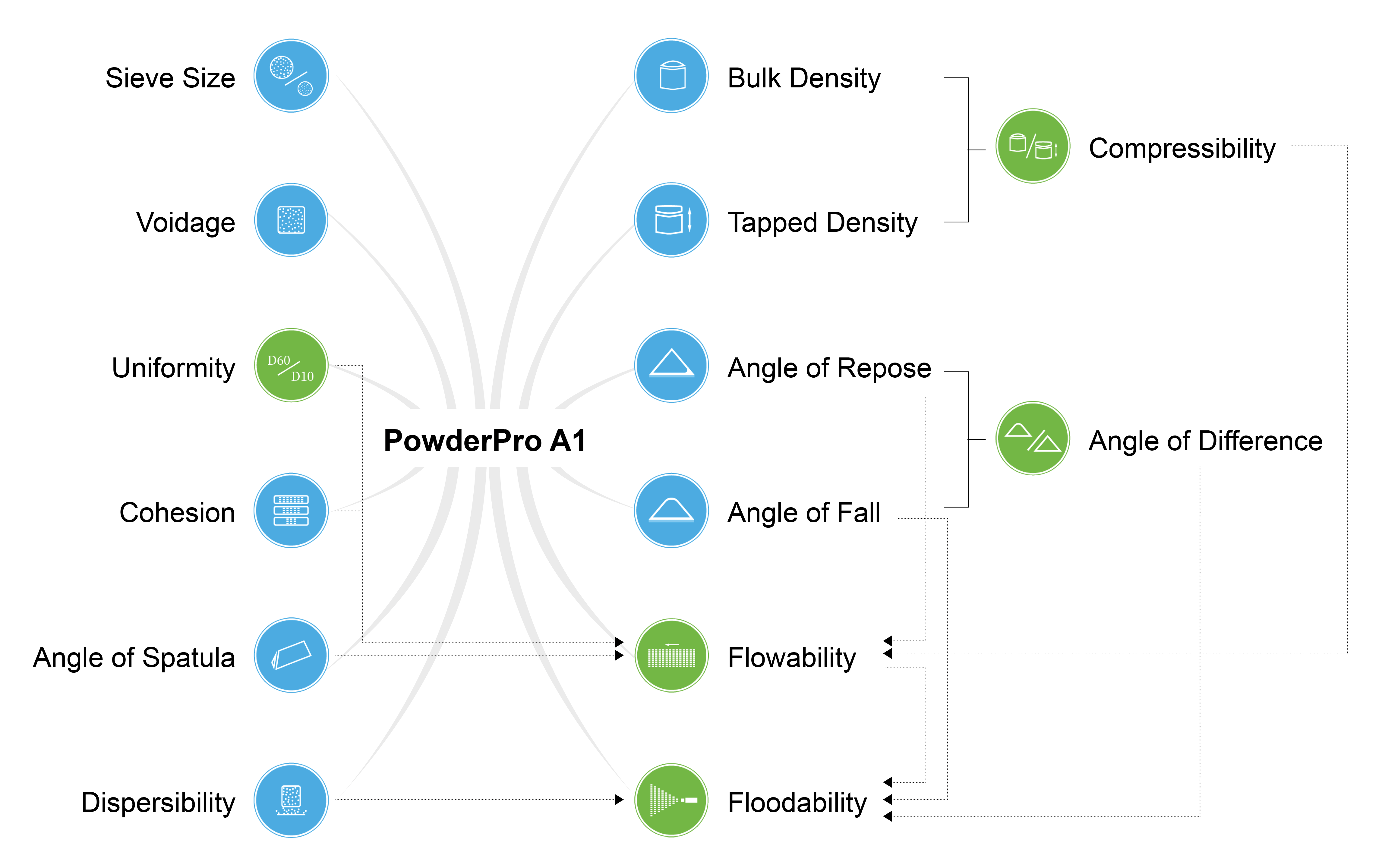 The PowderPro A1 can be used to achieve nine quantified items, such as the angle of spatula, angle of fall, angle of repose, cohesion, bulk density, dispersibility, voidage, tapped density, sieve size and five calculated items, such as the angle of difference, uniformity, compressibility, floodability index, flowability index, all with a single instrument.