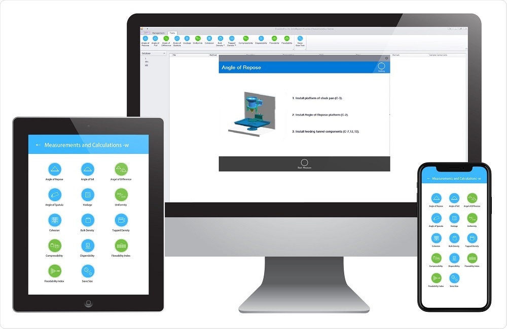 Powder Tester App, for tablets and smartphones, is the only App available in the powder characteristic market. It has been developed to provide users with the easiest way to quantify up to 14 physical properties of their samples.