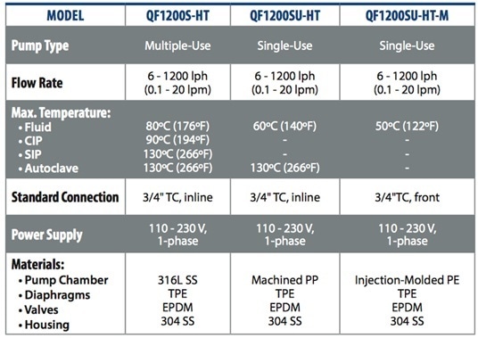 • Multiple-Use: The Quattroflow stainless-steel Multiple-Use pumps ensure that researchers acquire the highest level of purity, exceptional containment and cleanability while completing biopharmaceutical-manufacturing operations that range from simple product transfer to critical and demanding filtration and chromatography applications. With autoclave capabilities, the Multiple-Use pumps are suitable tools for clean-in-place/steaming-in-place (CIP/SIP) operations.