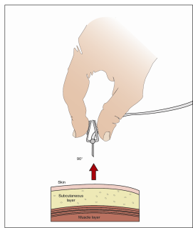 Insert needle with a rapid motion straight into the skin at a 90-degree angle. Tape needle in place with sterile tape (included on transparent dressing).