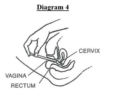 The lips of the vagina should be parted with the fingers of one hand. Grasp the applicator between the thumb and middle finger of the other hand and insert it (open end first) into the vagina as deeply as it will comfortably reach (see diagram 4).