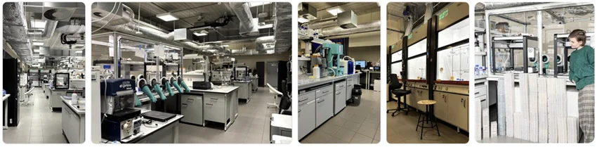 Four pictures of a lab from different angles. The fourth picture features a person looking at a stack of materials.