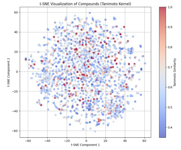 t-SNE visualization of compounds. t-SNE component 2 (y axis), t-SNE component 1 (x axis).