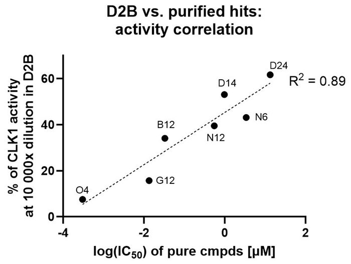 • Strong (0.89 R2) correlation between D2B crude activity and purified IC50 ranking