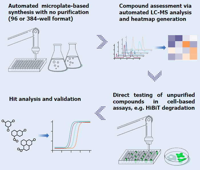 The accelerated DMTA approach features an automated microplate-based synthesis with no purifications in either a 96- or 384-well format. Compound analysis is carried out via automated LC-MS analysis and heatmap generation, before the direct testing of unpurified compounds in cell-based assays, such as HiBiT degradation. These analyses create Hit analysis and validation.