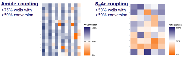 Amide coupling demonstrates over 75 % of wells with over 50 % conversion. SNAR coupling demonstrates over 50 % of wells wih over 50 % conversion.
