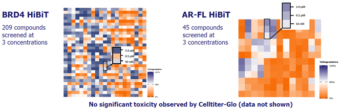 BRD4 HiBiT analyzed 209 compounds, screened at three concentrations. AR-FL HiBiT analyzed 45 compounds at three concentrations. No significant toxicity was observed by Celltiter-Glo (data not shown).