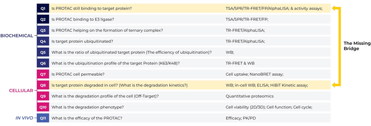 For PROTAC, the SAR is much more difficult than traditional small molecules (inhibitors), since the connection between biochemical and cellular data is not clear. Currently, Western blot is used to evaluate the effectiveness of PROTAC degradation of a target protein, but there is a wide gap between target protein binding and target protein degradation; the “missing bridge”. The high complexity of a PROTAC molecule compared to a traditional small molecule means that robust assays that bridge the gap between the biochemical and cellular data need to be introduced.
