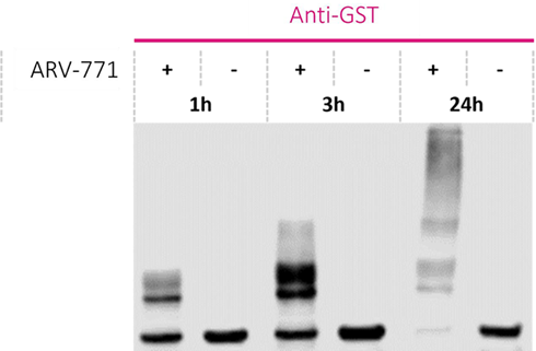 "Ladder pattern" of target protein formed by a PROTAC in a ubiquitination assay. Protein ubiquitination increases over time, and for some PROTACs, complete poly-ubiquitination of the target protein can be observed.