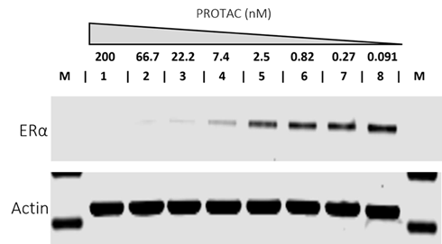 Western blot assay on a cell line treated with PROTAC. Target protein degradation increases in line with the concentration of PROTAC used in the assay