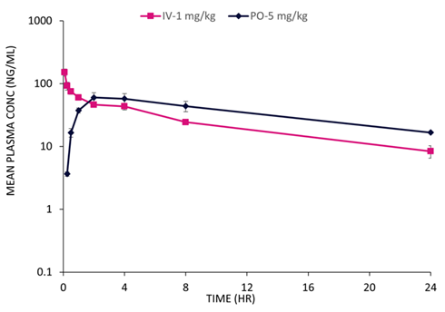 PK plasma profile following intravenous and oral administration of a PROTAC. Typical intravenous and oral plasma profiles were observed in dogs.