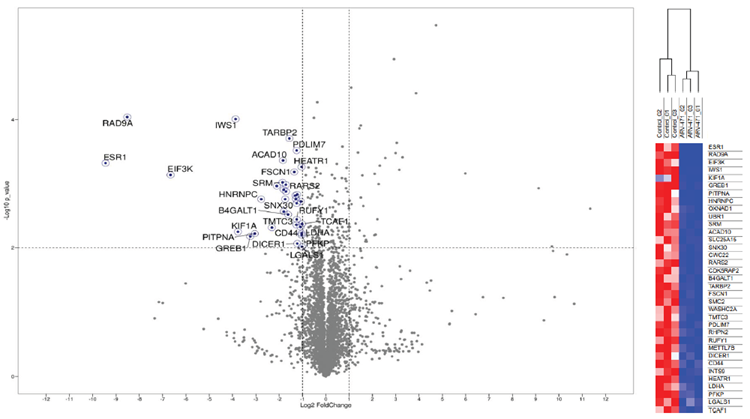 Fig. 10 (left) and 11 (right). Proteomic analysis of ARV-471 treated XMCF-7 tumors. Volcano plot (left) of significantly deregulated proteins identified in the control vs ARV-471 tumor lysates. Hierarchical clustering (with Euclidean distance) (right) of the top 35 down-regulated proteins in control vs. ARV-471 (>1 unique peptide, P-value <0.001, ≥2-fold decrease in protein level). Image Credit: Image courtesy of Kieran Casey et al., in partnership with ELRIG (UK) Ltd.