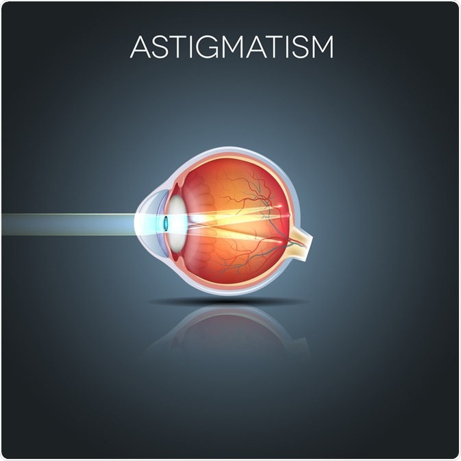 Astigmatism is a refractive error that creates asymmetric blur in the vision due to the irregular corneal curvature/shape (corneal astigmatism) or the lens (lenticular astigmatism).  Due to this condition, the light rays that enter the eye fail to converge at a single focal point on the retina and form two foci instead. The lack of a single focus point results in the formation of blurred images on the retina.