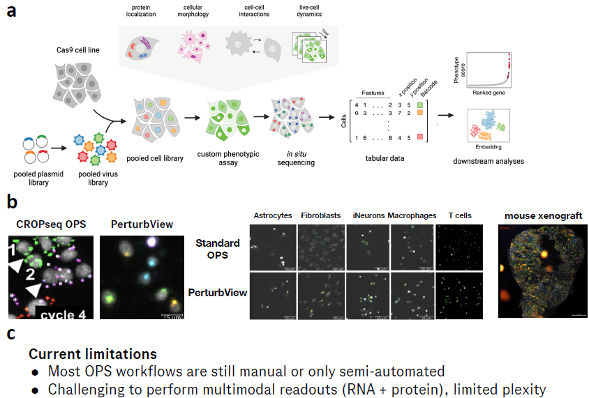 Figure 1. Optical pooled screens and PerturbView. a) Optical pooled screens (OPS) use targeted in situ sequencing of perturbations to link phenotypes and genotypes from a pooled library, making it practical to perform genome-wide imaging screens. b) PerturbView uses in vitro transcription to substantially amplify ISS signal, enabling screens in a wide variety of model systems with highly multiplexed phenotypic readouts. c) Currently, it is fairly laborious to perform OPS experiments and challenging to integrate multimodal readouts with ISS. Image Credit: Image courtesy of Avtar Singh et al., in partnership with ELRIG (UK) Ltd.