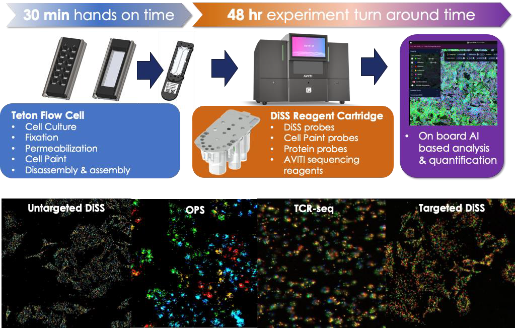 Figure 2. Cytoprofiling on Element AVITI24. The AVITI24 platform enables the simultaneous detection of high-plex protein expression, morphological analysis using Cell Paint, and DiSS of reads exceeding 100 bases. This approach supports both untargeted total transcriptome analysis and targeted probe panels designed for specific applications, including Optical Pooled Screening (OPS), T-cell and B-cell receptor sequencing, and the analysis of specific genes of interest. Image Credit: Image courtesy of Avtar Singh et al., in partnership with ELRIG (UK) Ltd.