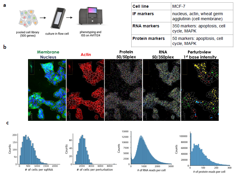 Figure 3. A 500-gene screen leveraging morphological, RNA, and protein readouts. a) Schematic of the screening workflow and table summarizing the phenotypic panel. b) Example images from the screen. c) The screen sampled 490 cells/guide and 2074 cells/gene (median). d) Most cells captured ~900 RNA counts and ~70 protein counts across 350 RNA and 50 protein markers. Image Credit: Image courtesy of Avtar Singh et al., in partnership with ELRIG (UK) Ltd.