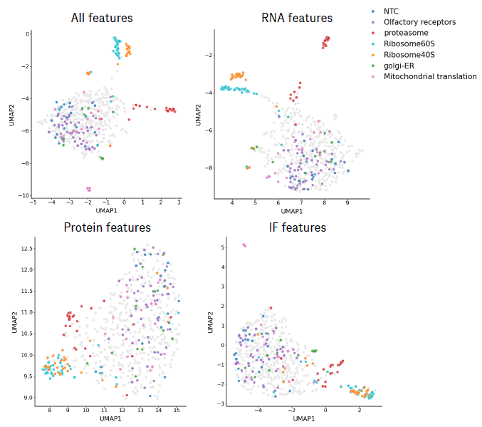 Figure 5. Cytoprofiling on Element AVITI24. Phenotypic embeddings of perturbations using all features, morphology, RNA, or protein. Image Credit: Image courtesy of Avtar Singh et al., in partnership with ELRIG (UK) Ltd.