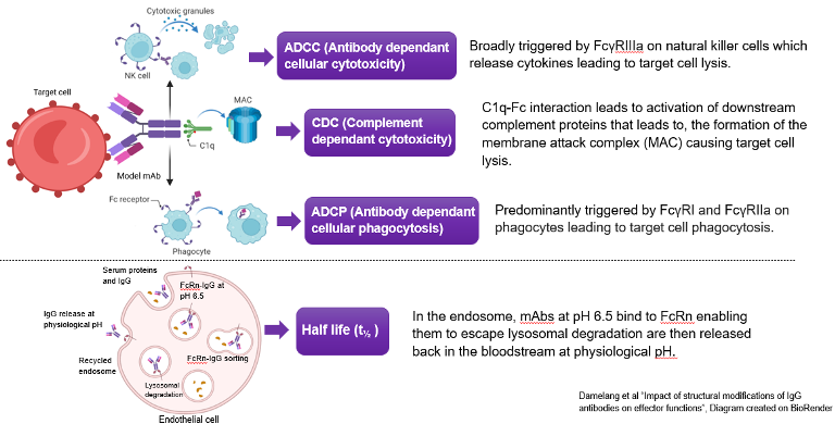 Figure 1. All three effector function pathways and half-life mechanism triggered by the Fc region. Image Credit: Damelang et al "Impact of structural modifications of IgG antibodies on effector functions", Diagram created on BioRender