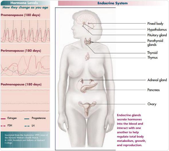 During perimenopause the ovaries begin to shrink in size. As menopause is reached the female hormone estrogen and progesterone levels decrease. Hormone levels fluctuate during perimenopause and slowly the ovaries become resistant to FSH. This causes increased release of FSH from the pituitary to keep up estrogen production. This can cause irregular menstrual cycles and unpredictable episodes of heavy bleeding during the perimenopausal years.