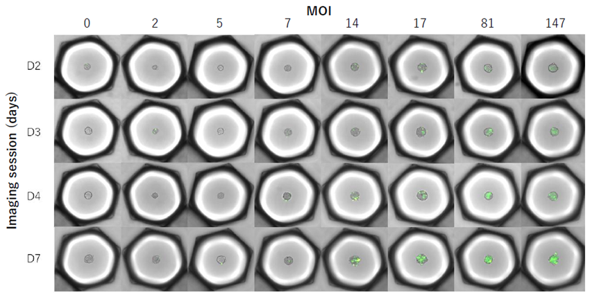 Figure 1. OKOMERA AI-Based Time-Lapse Overview of MCF7 spheroids across different MOIs. Increasing GFP fluorescence in most of the spheroid area is observed with increasing MOI. Representative traps are shown over time, with GFP signal in green. Image Credit: Image courtesy of T Duboys et al., in partnership with ELRIG (UK) Ltd.