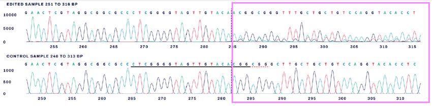 Figure 4. Sanger sequencing analysis of CRISPR-edited and control alleles. Sanger sequencing traces showing wild-type and CRISPR-edited samples at the target locus. The black underline marks the gRNA sequence, the red underline the PAM site, and the dashed line the Cas9 cut site. Mixed peaks in the edited trace indicate indels from NHEJ repair. Image Credit: Image courtesy of T Duboys et al., in partnership with ELRIG (UK) Ltd.