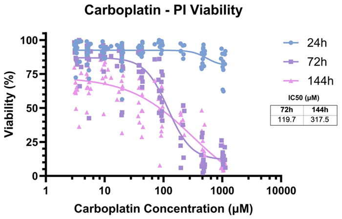 Figure 6. Dose-response curves for carboplatin treatment of MCF7 spheroids on a microfluidic chip. Cell viability at 24 hours (blue), 72 hours (purple), and 144 hours (pink), showing time-dependent drug sensitivity. Viability was calculated as the ratio of the spheroid area with a PI signal above the death threshold to the total area. Image Credit: Image courtesy of T Duboys et al., in partnership with ELRIG (UK) Ltd.