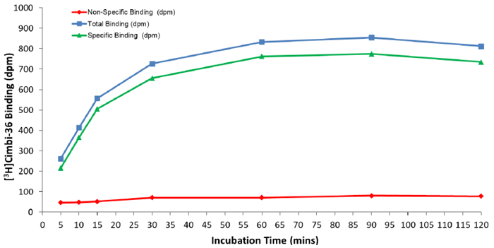 Figure 3. Incubation time course for 0.06 nM [3H]cimbi-36 binding to 5-HT2A receptors in mouse frontal cortex.