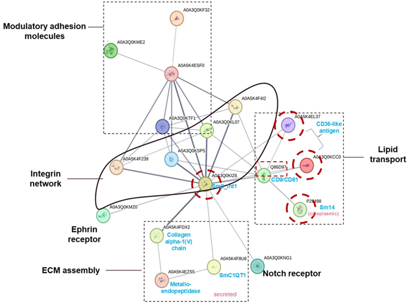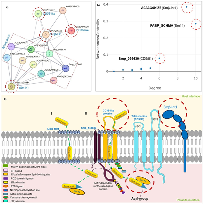 Protein-protein interaction analysis revealed CD36-like receptors, tetraspanins, Smβ-Integrin, and Sm14 as central hubs in lipid acquisition and signaling. These proteins form a coordinated complex at the host-parasite interface:
