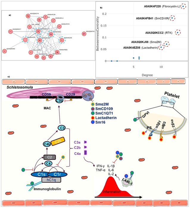 Figure 4. Panel (a) shows the protein-protein interaction (PPI) network of lipid transport-related candidates. Panel (b) plots Betweenness Centrality versus Degree, identifying three top-ranked hub proteins. Panel (c) illustrates a schematic model of lipid acquisition at the host-parasite interface. Image Credit: Image courtesy of Evans Asamoah Adu, in partnership with ELRIG (UK) Ltd.