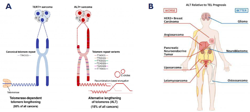 A. Tumors use two predominant mechanisms to maintain telomere length, ALT and TEL. Image Credit: Nucleic acids research, Frank et al 2012; B. ALT is associated with poor prognosis in a range of different cancer types. Image Credit: MDPI cancers, Mackenzie Jr et al 2021