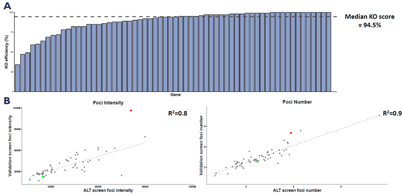 A. KO scores determined by Inference of CRISPR edits (ICE) software for the entire panel of genes selected for the follow-up validation screen. B. Scatterplots highlighting correlation between ALT and validation screens for foci number and intensity. Image Credit: Image courtesy of Manners O et al., in partnership with ELRIG (UK) Ltd.
