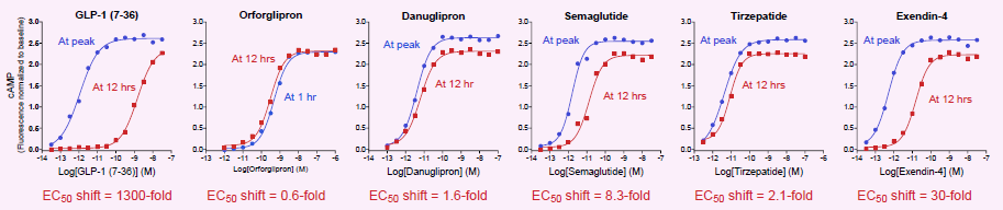 - Persistence of cAMP signaling quantified as the shift of potency (EC50) over time, from cAMP at the peak to cAMP at 12 hours (or from 1 hour to 12 hours for orforglipron).