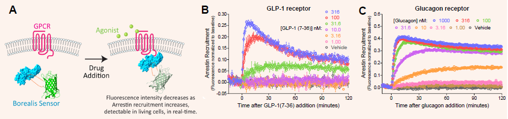 Fluorescent arrestin biosensor (Borealis) (A) directly quantifies arrestin interaction with unmodified GLP-1-R (B) and Glucagon-R (C) in HEK cells.7 Arrestin recruitment to GIP-R was not detectable.