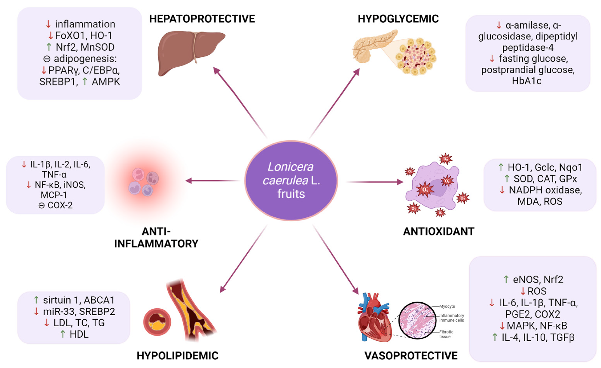 The main mechanisms of action described in the present review for the cardio-metabolic properties of Lonicera caerulea L. (↑ - increase; ↓ - decrease).1