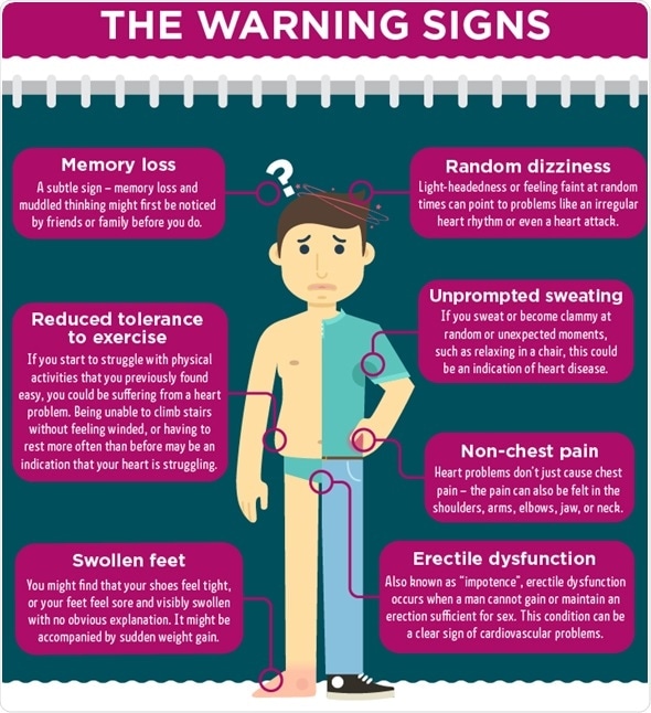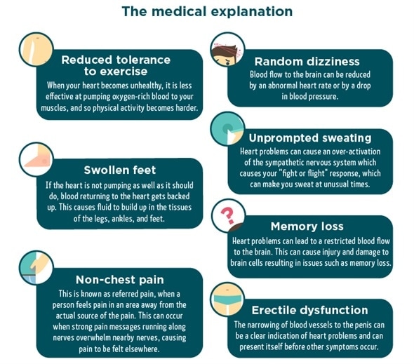 However, don’t be too alarmed – many of these symptoms can be easily explained and may not be linked to your heart’s health. Some of these symptoms, such as erectile dysfunction, can also be treated in the short term until you work to improve your cardiovascular health.