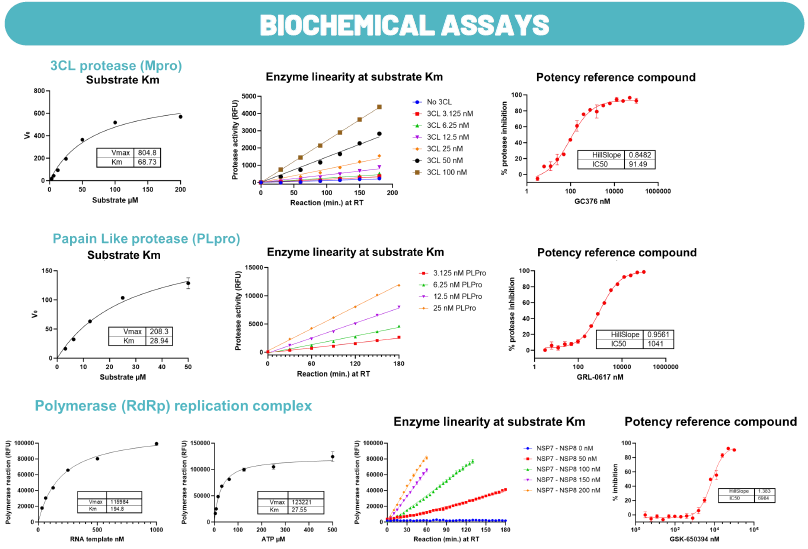 Biochemical assay: For the two viral proteases and the polymerase enzymes. For all the enzymes, they reported the Km calculation for the substrate, the enzymatic linearity at substrate Km, and the profile of the reference molecule.