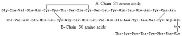 Normal insulin that is biologically active is monomeric or exists as a single molecule. It has two long amino acid chains or polypeptide chains. The chains are chain A with 21 amino acids and chain B with 30 amino acids.