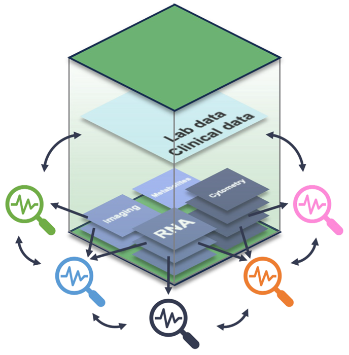 Figure 7. Schematic diagram of cross-analytic flexibility enabled by the MuData multimodal framework. Specialized analyses can be performed on one or more data modalities, but their output can also be analyzed with other outputs and with clinical and experimental observations. Image Credit: Image courtesy of Matthew Chung et al., in partnership with ELRIG (UK) Ltd.