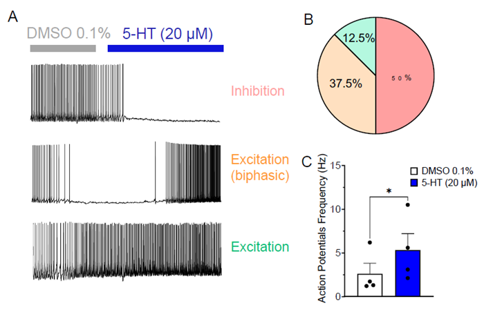 (A) Traces of PFC neurons' action potentials after 20 μM 5-HT. (B) % neurons responding with: inhibition (red), biphasic excitation (orange), or excitation (green) to 20 μM 5-HT. (C) Action potential frequency of neurons exhibiting an excitatory response to 20 μM 5-HT (excitation + excitation (biphasic)).
