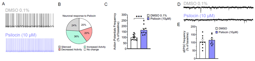 (A) Traces of PFC neurons' action potentials in response to 10 μM Psilocin (increased activity). (B) % of neurons that responded to 10 μM Psilocin with a: silencing (grey), increased activity (green), decreased activity (red), or no change (white) in action potential frequency. (C) Action potential frequency of neurons that exhibited an excitatory response to 10 μM Psilocin (p<0.001). (D) Representative traces of PFC neurons' excitatory post-synaptic currents in response to 10 μM Psilocin. (E) sEPSC frequency in response to 10 μM Psilocin. Image Credit: Elisabetta Perdona et al., in partnership with ELRIG (UK) Ltd.