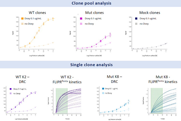 A series of graphs showing cell line generation and clone selectionusing thalium response, by both clone pool and single pool analyses.