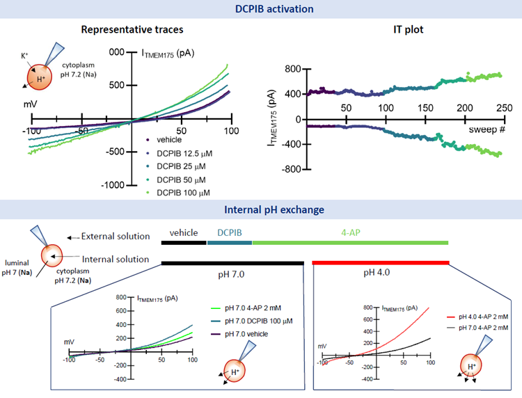 • DCPIB clearly activates TMEM175 currents at the lysosomal level, with an EC50 comparable to that observed in whole-cell recordings.