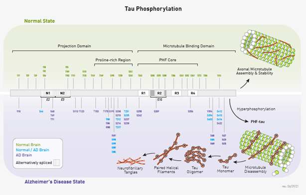 Tau was originally identified for its role as a microtubule associated protein. It has since been shown to be important in axonal growth and function due to its influence on neuronal microtubule stability. The function of tau is regulated by post-translational modification at more than 50 sites. Altered amount of phospho-tau is included in these regulatory modifications (Figure 1).