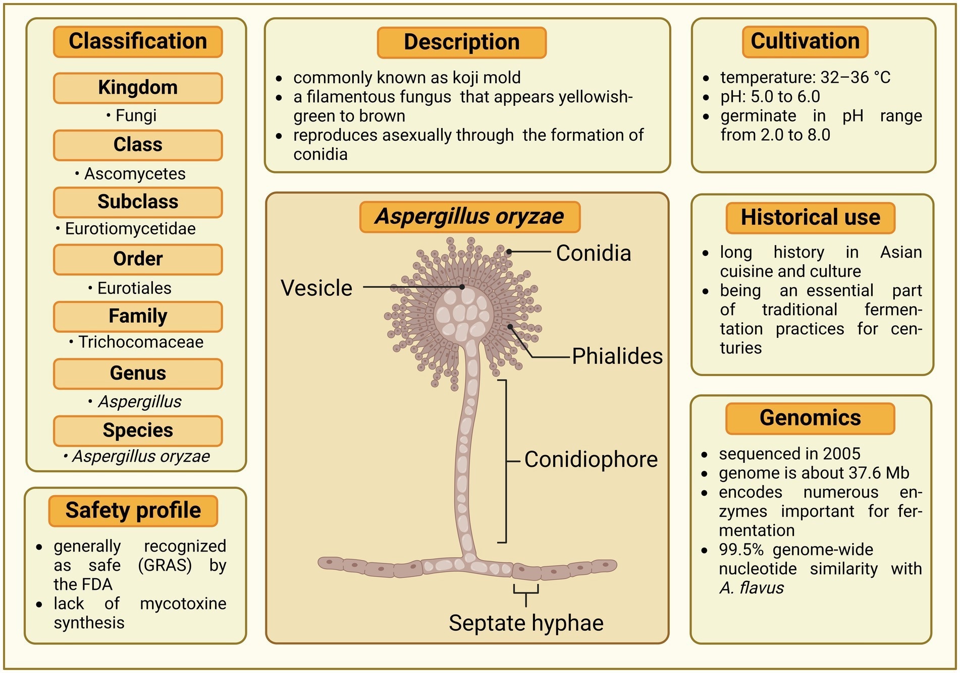 Comprehensive profile of Aspergillus oryzae. The central illustration depicts the morphological structures of A. oryzae, including vesicle, conidia, phialides, conidiophore, and septate hyphae. Surrounding the illustration are key aspects of the fungus, covering its classification, safety profile, description, cultivation requirements, historical use, and genomic characteristics. Created in BioRender. Seidler, Y. (2024) BioRender.com/i28s583.7