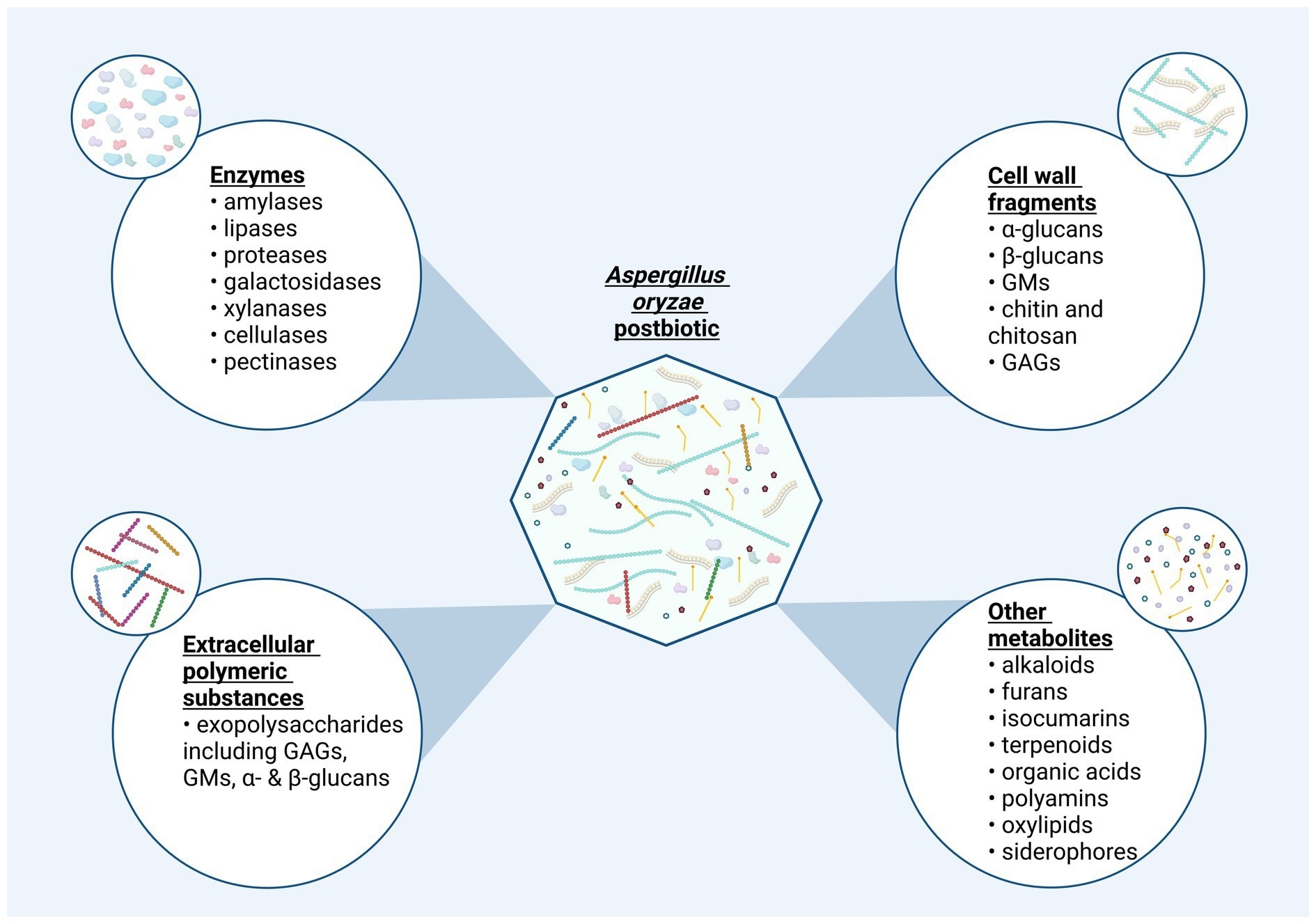 he potential composition of a postbiotic product derived from Aspergillus oryzae. Postbiotics produced via fermentation with A. oryzae may display a diverse molecular composition. Bioactive compounds in this inanimated fermentation preparations can be organized in four categories: “Non-viable cells or cell-fragments,” “enzymes,” “extracellular polymeric substances,” and “other metabolites”. The latter category is reserved for primary and secondary metabolites not fitting the prior classifications. This categorization provides a structured insight into potential ingredients present in postbiotics derived from A. oryzae. Created in BioRender. Seidler, Y. (2024) BioRender.com/f31t998