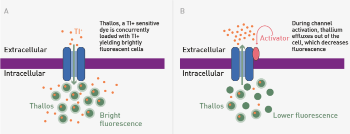 Thallium Flux Snapshot Assay Principle. A) The loading step B) Compound activation of a GIRK leads to efflux of thallium (Tl-) and decreased fluorescence signal