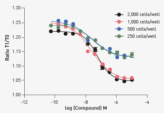 Fig 2. Optimization of assay cell number. The indicated number of cells was treated with varying concentrations of compound, and thallium efflux was determined by the Tf/T0 ratio produced by readings on the PHERAstar FSX after 5 minutes of incubation. Image Credit: Image courtesy of Sivakumar, M et al., in partnership with ELRIG (UK) Ltd.