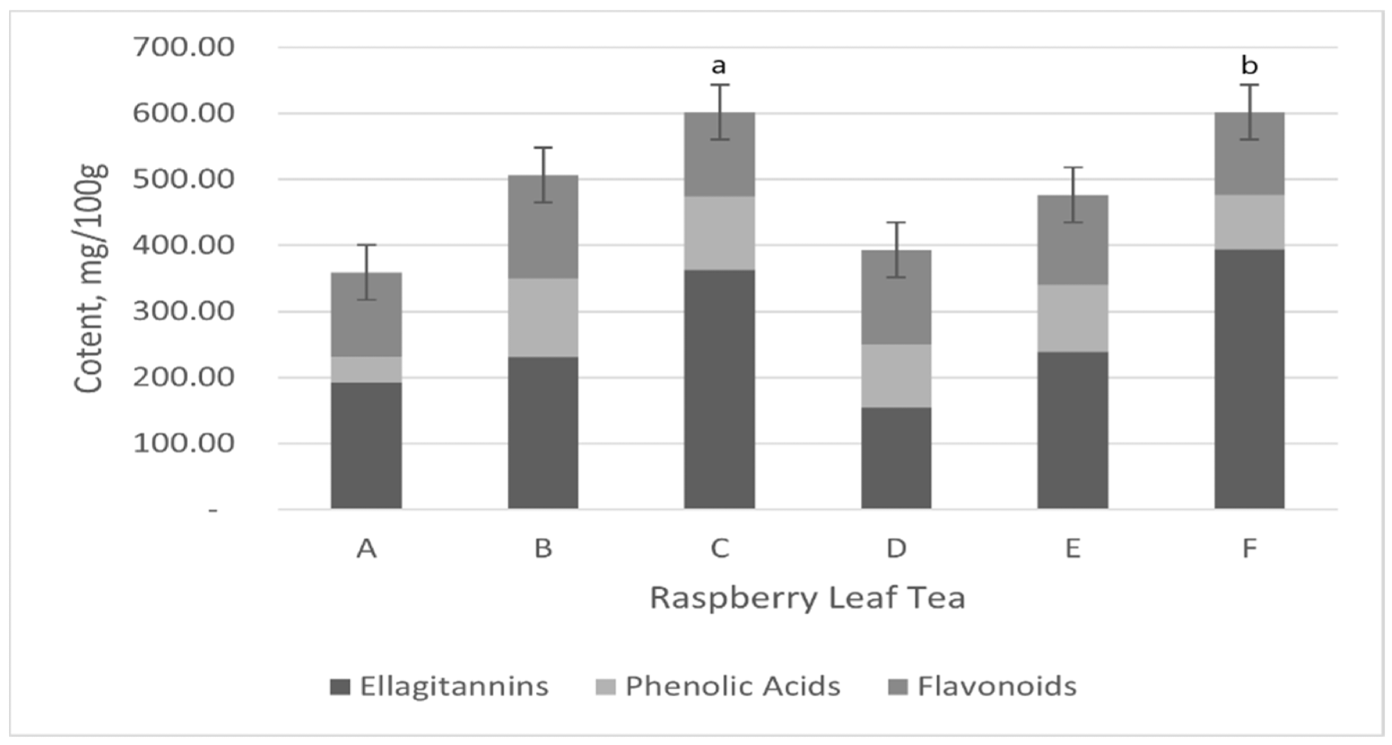 Comparative analysis of total polyphenol content in different raspberry leaf tea samples. Light grey: flavonoids; black: ellagitannins; white: phenolic acids, p < 0.001 (mean ± S.D., n = 3). Mean concentrations of polyphenol, flavonoids, ellagitannins, and phenolic acids in teas from different countries. Data are presented as mean ± standard deviation (n = 3). Samples include tea from Croatia (A), Bulgaria (B), the United Kingdom (C), Belgium (D), Germany (E), and Poland (F). Bars sharing the same letter indicate significant differences (p < 0.001 vs. all sample teas marked “a”; p < 0.05 vs. A, B, D, and E marked “b”).1Comparative analysis of total polyphenol content in different raspberry leaf tea samples. Light grey: flavonoids; black: ellagitannins; white: phenolic acids, p < 0.001 (mean ± S.D., n = 3). Mean concentrations of polyphenol, flavonoids, ellagitannins, and phenolic acids in teas from different countries. Data are presented as mean ± standard deviation (n = 3). Samples include tea from Croatia (A), Bulgaria (B), the United Kingdom (C), Belgium (D), Germany (E), and Poland (F). Bars sharing the same letter indicate significant differences (p < 0.001 vs. all sample teas marked “a”; p < 0.05 vs. A, B, D, and E marked “b”).1